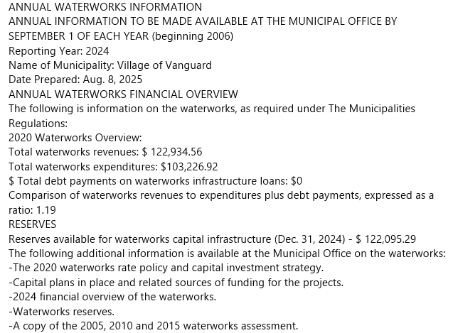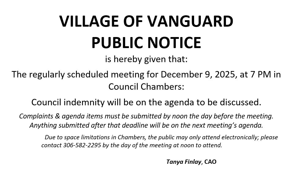 The Village of Vanguard, Box 187, Vanguard, SK S0N 2V0; 306-582-2295; vill.vanguard@sasktel.net