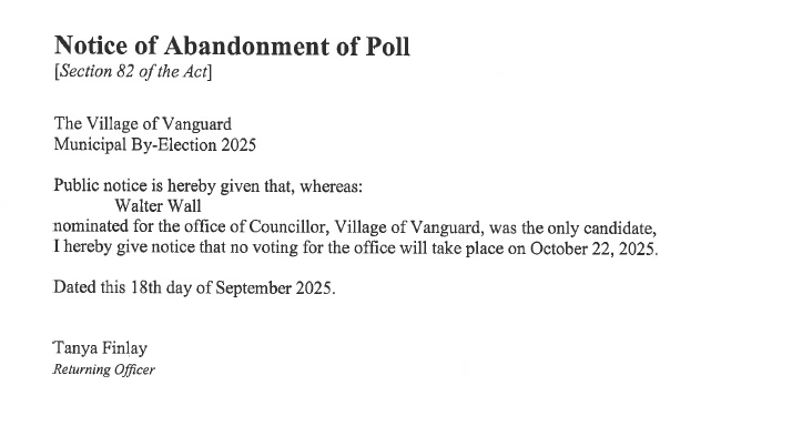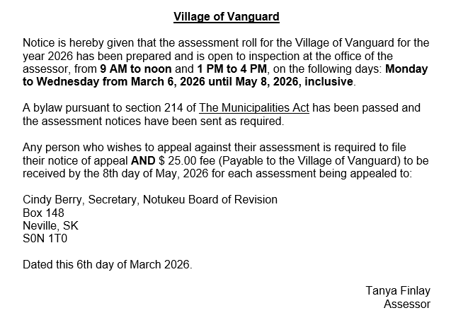 The Village of Vanguard, Box 187, Vanguard, SK S0N 2V0; 306-582-2295; vill.vanguard@sasktel.net