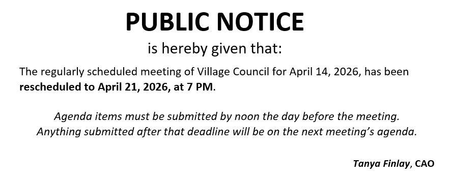 The next meeting of Council will be on April 21, 2026 at the Village Office at 7 PM.